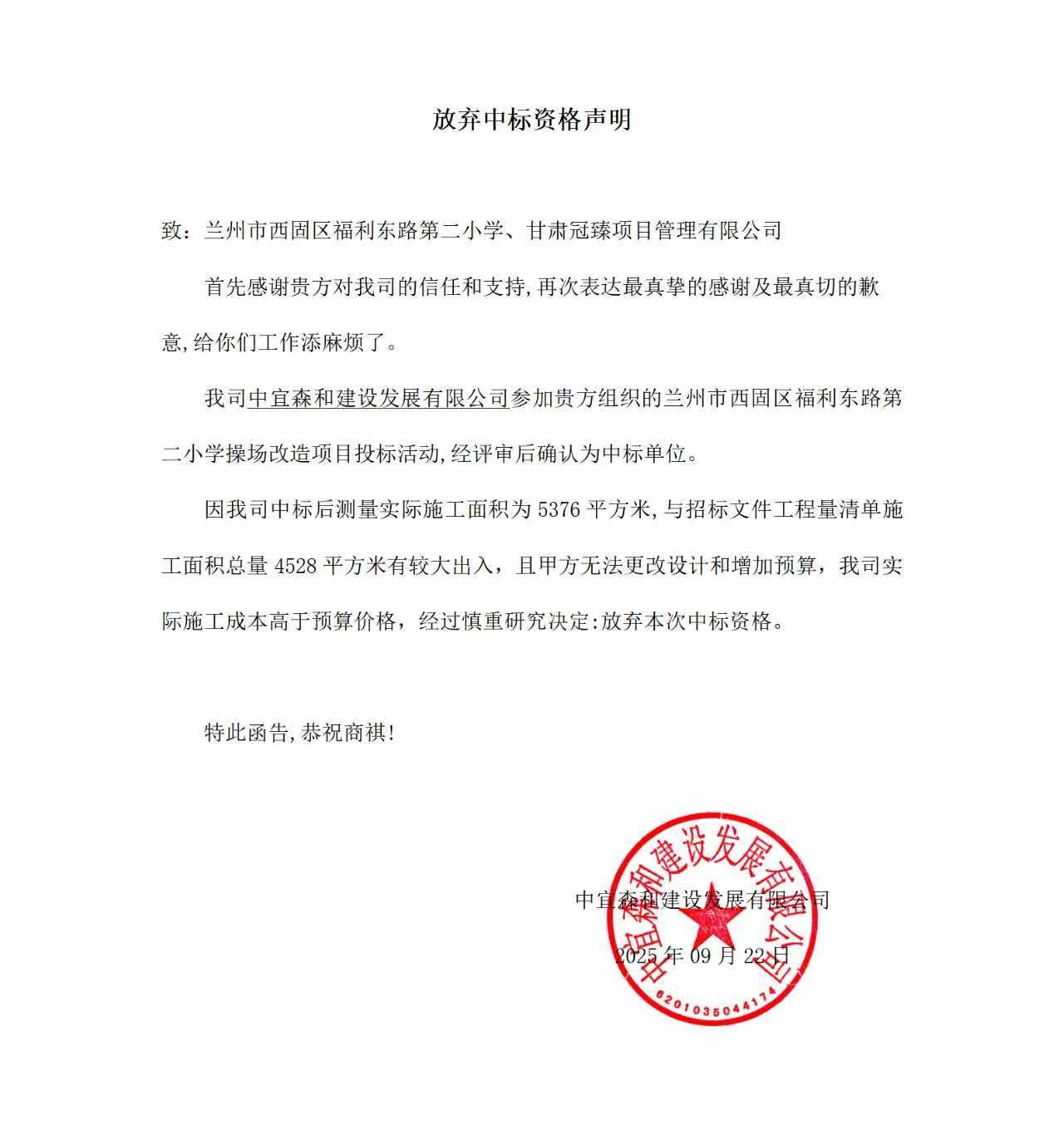 4、由于磋商小組推薦的第一名中宜森和建設(shè)發(fā)展有限公司主動放棄成交資格,根據(jù)《政府采購法實施條例》第四十九條規(guī)定,政府采購項目中第一名棄標后,采購人可以按照評審報告推薦的中標或者成交候選人名單排序,確定下一候選人為中標或者成交供應商,故本項目確定成交供應商為磋商小組推薦的第二名:甘肅濟偉建設(shè)有限公司。