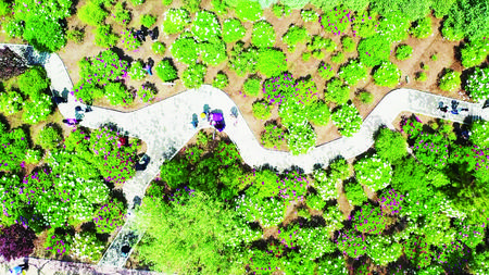 工人呂玉福告訴記者:“牡丹花朵里積存了大量雨水,如果不用繩子將牡丹捆綁,這些牡丹就會倒伏?!边@些10年前栽植的牡丹,如今成為一道壯麗的城市景觀,形成了全長30公里的牡丹景觀帶。