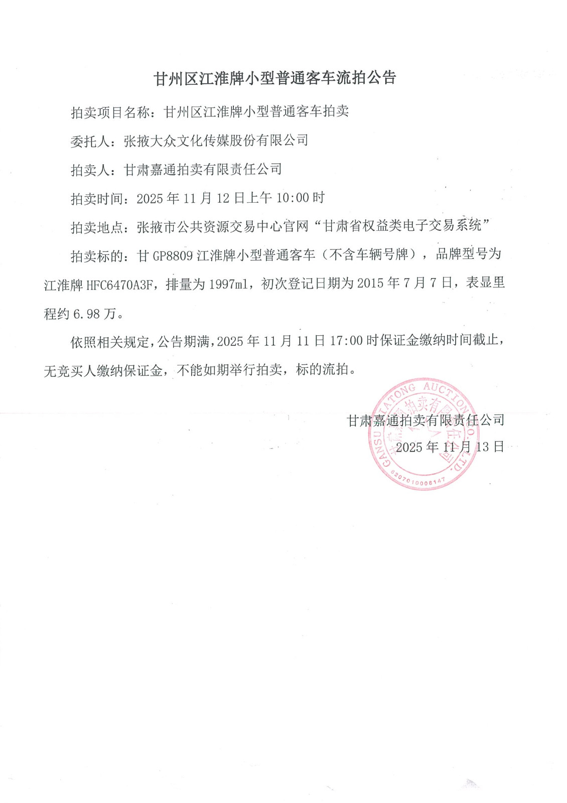 甘州區(qū)江淮牌小型普通客車流拍公告