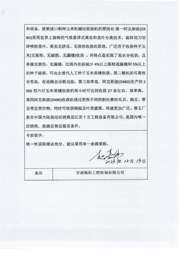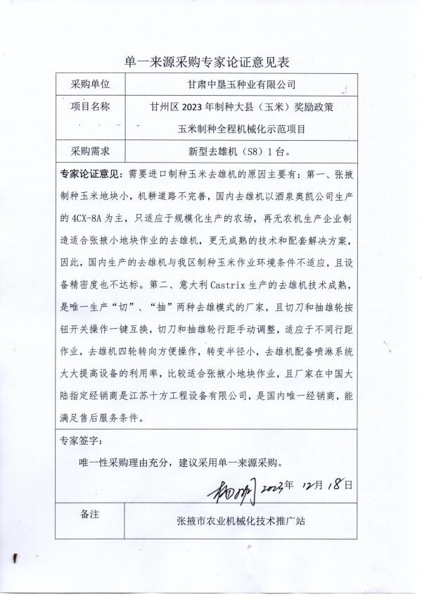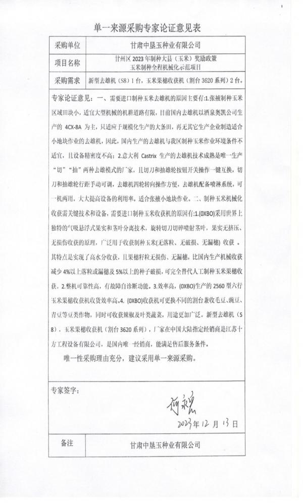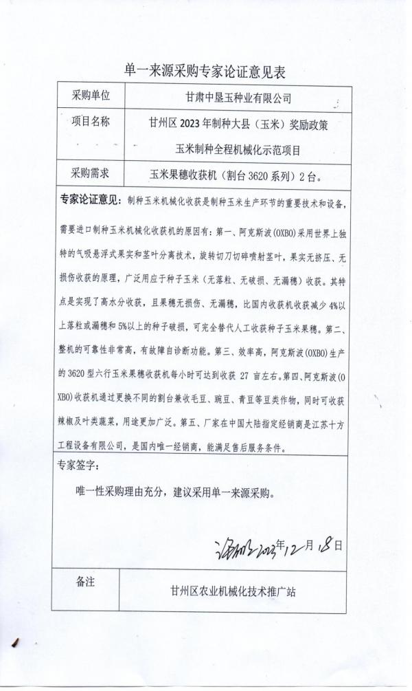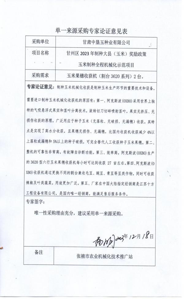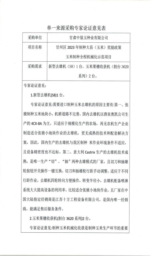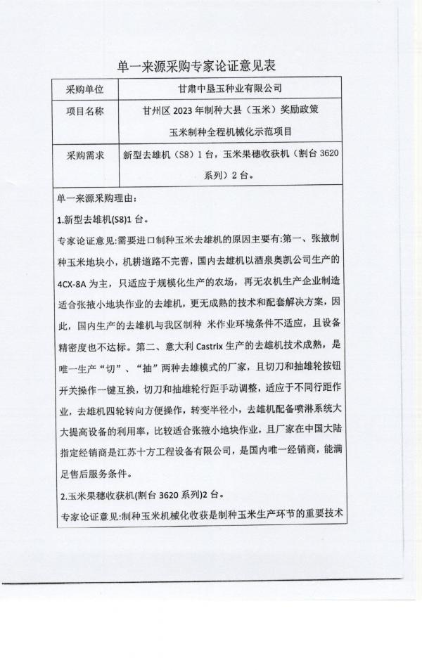 甘州區(qū)2023年制種大縣(玉米)獎(jiǎng)勵(lì)政策玉米制種全程機(jī)械化示范項(xiàng)目單一來(lái)源采購(gòu)論證公示