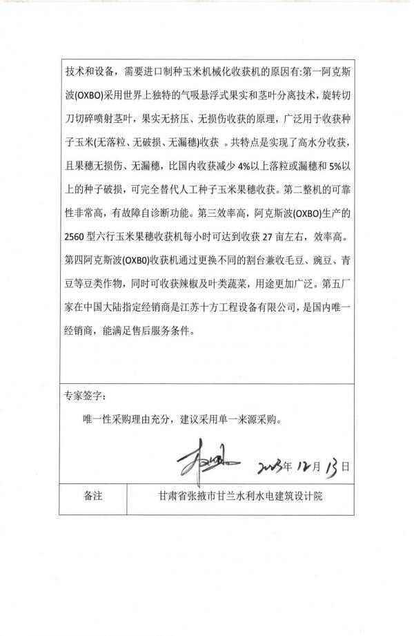 結(jié)論:綜合鑒定評(píng)價(jià)擬對(duì)甘州區(qū)2023年制種大縣(玉米)獎(jiǎng)勵(lì)政策玉米制種全程機(jī)械化示范項(xiàng)目(新型去雄機(jī)(S8)1臺(tái),玉米果穗收獲機(jī)(割臺(tái)3620系列)2臺(tái))采用單一來(lái)源方式采購(gòu)。