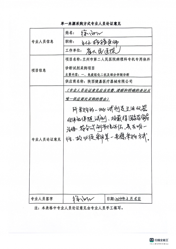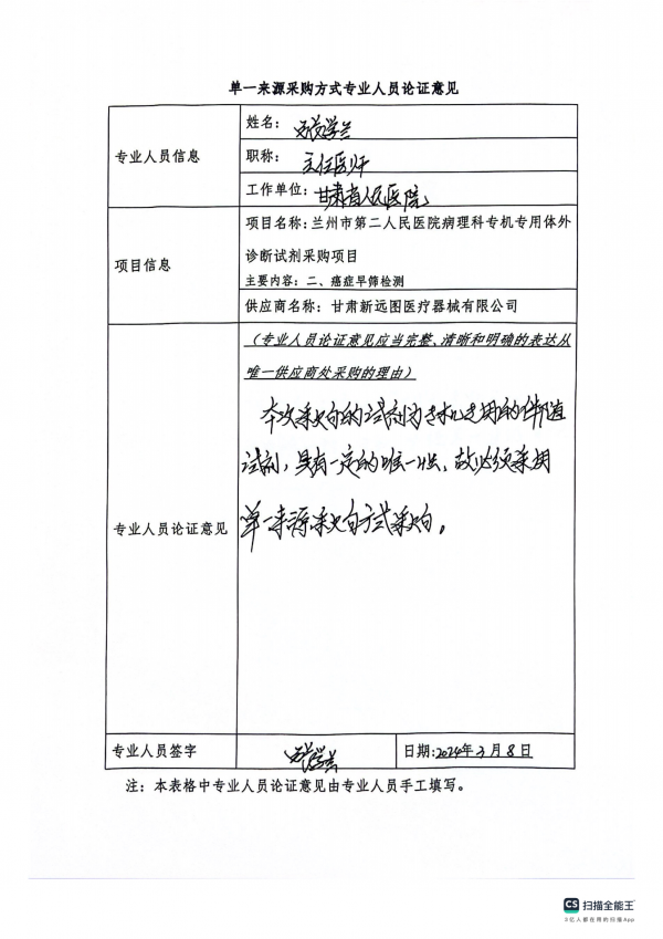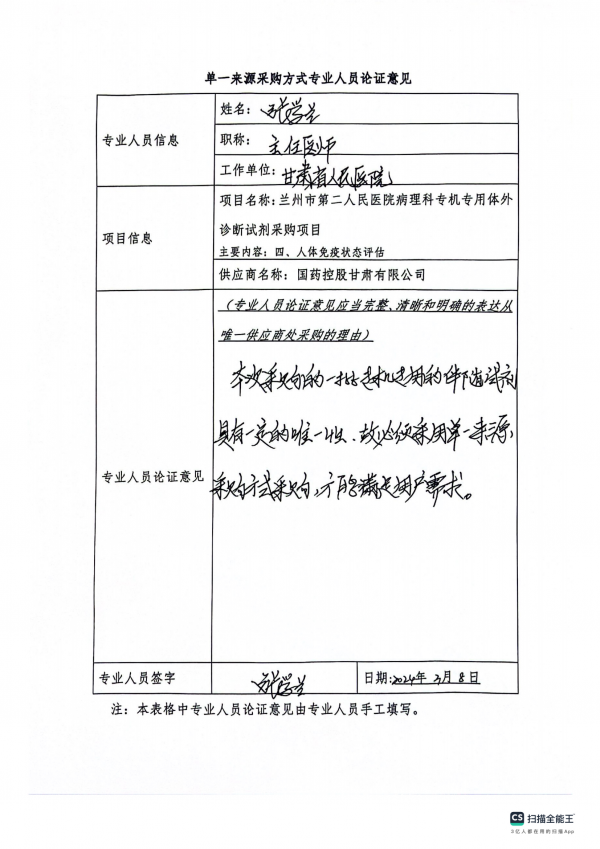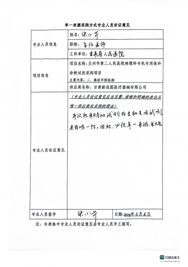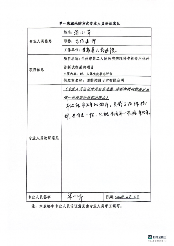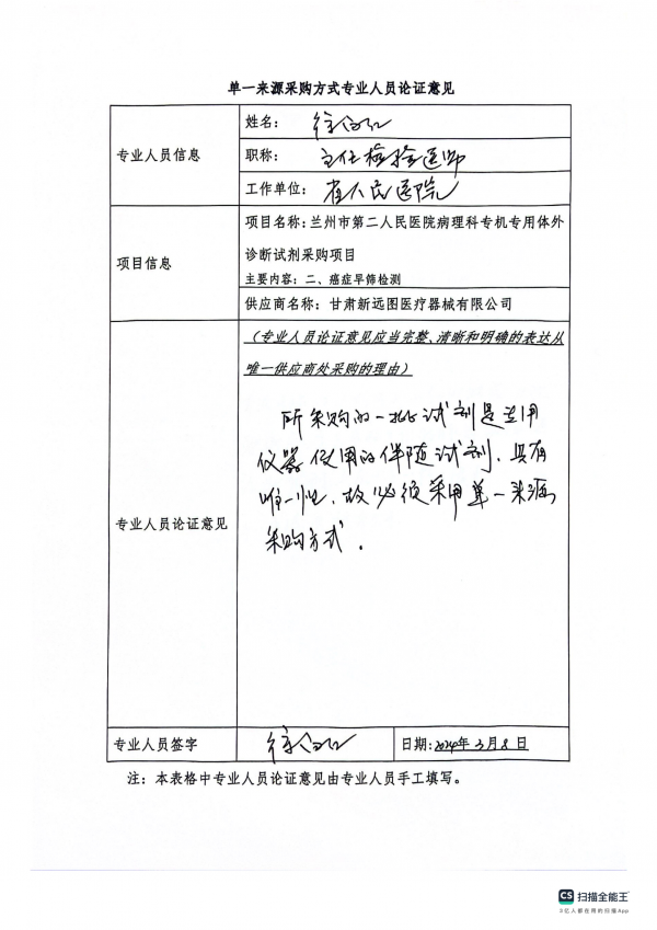 采用單一來源采購方式的原因及說明:我院在檢測時為保證診斷結(jié)果及時、準(zhǔn)確、可靠,且根據(jù)相關(guān)技術(shù)規(guī)范和操作規(guī)程,要求專用檢驗試劑及耗材的質(zhì)量穩(wěn)定,檢測靈敏度高,必須使用與儀器相匹配的專機專用試劑盒。故依據(jù)《中華人民共和國政府采購法》第三十一條第三款規(guī)定,我院擬采用單一來源方式對本項目進行采購。