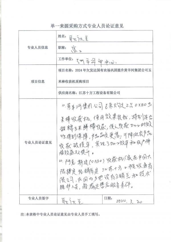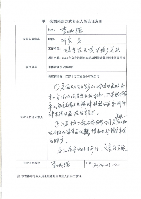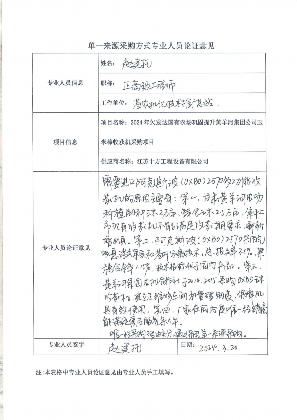 采用單一來源采購(gòu)方式的原因及說明:(1)阿克斯波(OXBO)2570多功能收獲機(jī)采用世界上獨(dú)特的氣吸懸浮式果實(shí)和莖葉分離技術(shù),旋轉(zhuǎn)切刀切碎噴射莖葉,果實(shí)無擠壓、無損傷收獲的原理,廣泛用于收獲甜糯玉米鮮棒、制種玉米(無落粒、無破損、無漏穗)收獲。(2)黃羊河集團(tuán)農(nóng)機(jī)合作社已于2014、2015年采購(gòu)2臺(tái)OXBO 玉米棒收獲機(jī),使用效果良好,特別適合公司甜糯玉米鮮棒收獲,使新鮮甜 糯玉米產(chǎn)品收獲加工時(shí)效性得到保障,實(shí)現(xiàn)了甜糯玉米產(chǎn)品品質(zhì)更高;進(jìn)一步降低農(nóng)產(chǎn)品收獲破損率,實(shí)現(xiàn)了加工效率和農(nóng)戶種植效益雙提升。 目前國(guó)內(nèi)其他鮮食玉米加工企業(yè)均采購(gòu)的是OXBO玉米棒收獲機(jī),業(yè)內(nèi)普及程度高,口碑良好。(3)玉米收獲機(jī)整機(jī)的可靠性非常高,有故障自診斷功能,同時(shí)黃羊河集團(tuán)農(nóng)機(jī)合作社已使用阿克斯波(OXBO) 收獲機(jī)多年,建立了專業(yè)維護(hù) 保養(yǎng)車間與完善的管理制度,對(duì)該機(jī)型的使用維修保養(yǎng)具有豐富的經(jīng)驗(yàn)和專業(yè)的團(tuán)隊(duì),為收獲機(jī)正常使用具備完整的管理體系和維護(hù)保養(yǎng)保障。(4)阿克斯波(OXBO)廠家在中國(guó)大陸指定經(jīng)銷商是江蘇十方工程設(shè)備有限公司,是國(guó)內(nèi)唯一經(jīng)銷商,在國(guó)內(nèi)多處設(shè)有分銷點(diǎn)和技術(shù)維護(hù)人員,能滿足售后服務(wù)條件。