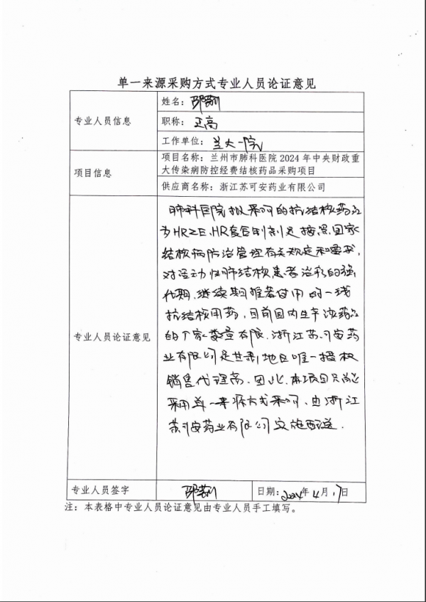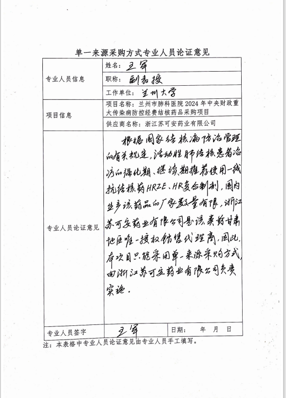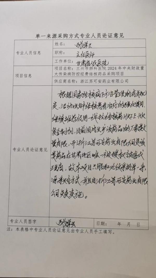 按照國(guó)家《結(jié)核病防治管理辦法》、《中國(guó)結(jié)核病預(yù)防控制工作技術(shù)指南》和《甘肅省結(jié)核病防治實(shí)施方案》等要求,活動(dòng)性肺結(jié)核患者治療的強(qiáng)化期、繼續(xù)期推薦使用一線抗結(jié)核藥HRZE、HR(乙胺吡嗪利福異煙片四聯(lián)R75mq、H37.5mq、Z200mg、E137.5mg;異福膠囊二聯(lián)H150mq、R300mg)復(fù)合制劑。目前國(guó)內(nèi)生產(chǎn)該藥品的廠家只有浙江蘇可安藥業(yè)有限公司。因此,本項(xiàng)目采購(gòu)具有一定特殊性、局限性,依據(jù)政府采購(gòu)法第三十一條第一款規(guī)定,擬定單一來源方式進(jìn)行采購(gòu)。