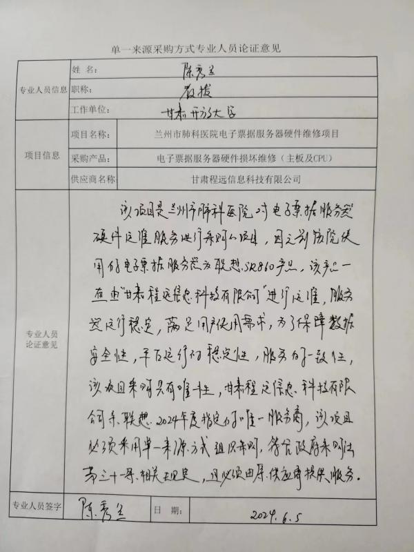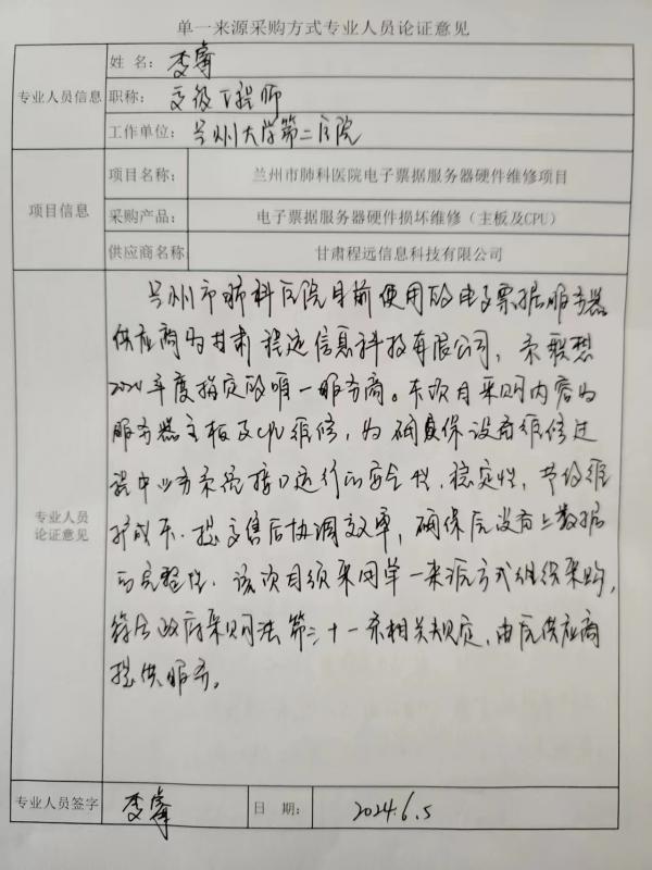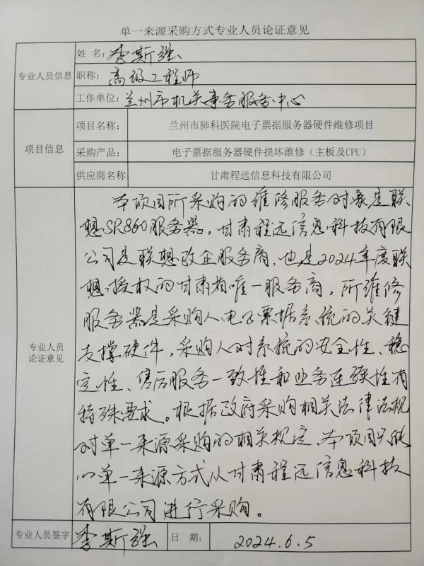 采用單一來源采購方式的原因及說明:蘭州市肺科醫(yī)院服務(wù)器硬件過期損壞,需與提供電子票據(jù)服務(wù)器的聯(lián)想政企服務(wù)商甘肅程遠(yuǎn)信息科技有限公司采購硬件維修項(xiàng)目,以保證原有信息系統(tǒng)的配套服務(wù)要求,故本次擬定供應(yīng)商為甘肅程遠(yuǎn)信息科技有限公司。鑒于上述原因,根據(jù)《中華人民共和國政府采購法》第三十一條規(guī)定,擬按單一來源方式進(jìn)行采購。