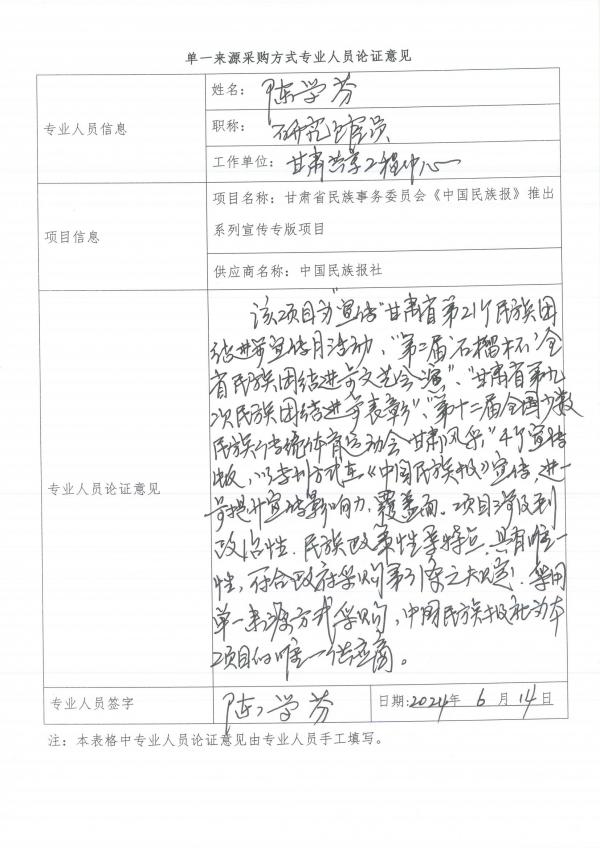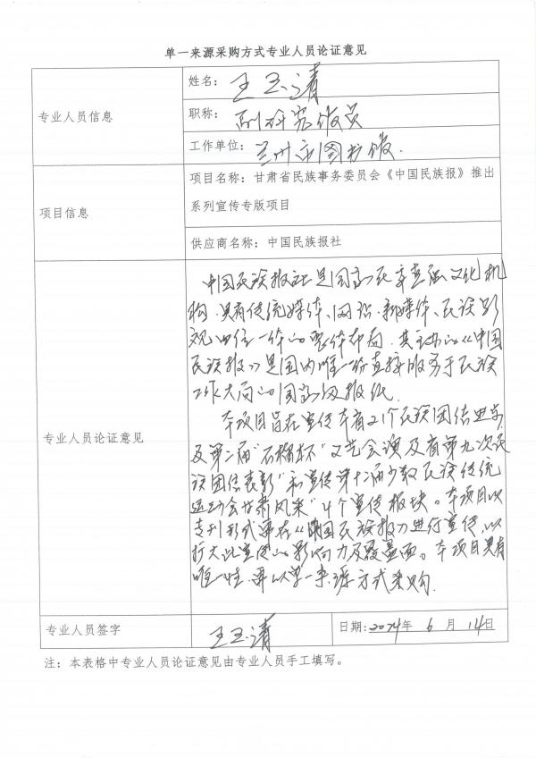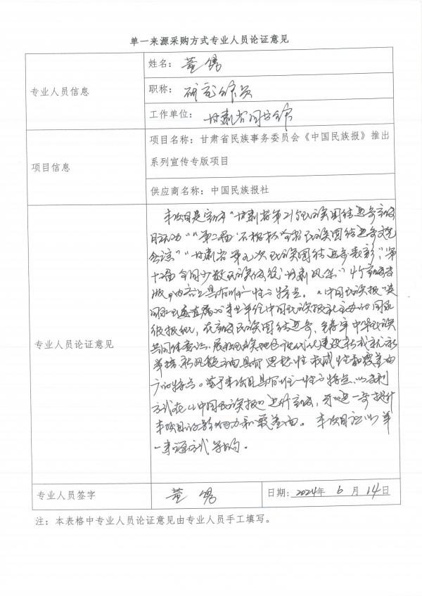 采用單一來源采購方式的原因及說明:采購人于2024年06月14日對該項(xiàng)目組織了專家論證,論證意見:中國民族報(bào)社是國家民委直屬文化事業(yè)單位,具有傳統(tǒng)媒體、網(wǎng)站、新媒體、民族影視四位一體的整體布局,主辦的《中國民族報(bào)》是國內(nèi)唯一一份直接服務(wù)于民族工作大局的國家級報(bào)紙。本項(xiàng)目是宣傳“甘肅省第21個民族團(tuán)結(jié)進(jìn)步宣傳月活動”“第二屆‘石榴杯’全省民族團(tuán)結(jié)進(jìn)步文藝會演”“甘肅省第九次民族團(tuán)結(jié)進(jìn)步表彰”“第十二屆全國少數(shù)民族傳統(tǒng)體育運(yùn)動會甘肅風(fēng)采”4個宣傳專版,以專刊方式在《中國民族報(bào)》宣傳,進(jìn)一步提升宣傳影響力、覆蓋面。本項(xiàng)目具有唯一性,為此特申請以單一來源方式采購。