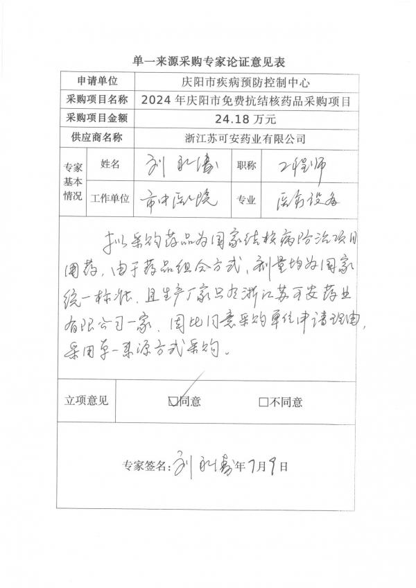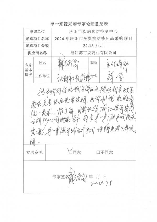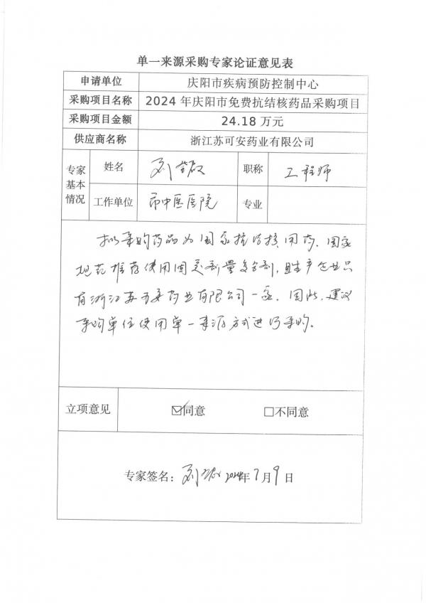 ?四、實(shí)施單一來(lái)源采購(gòu)的簡(jiǎn)要理由:按照《2024年中央補(bǔ)助地方甘肅省結(jié)核病防治項(xiàng)目實(shí)施方案》要求,免費(fèi)抗結(jié)核藥品由市州級(jí)疾控中心統(tǒng)一采購(gòu),國(guó)家規(guī)范推薦且全省統(tǒng)一要求使用固定劑量復(fù)合劑(FDC),目前全省使用的FDC乙胺吡嗪利福異煙片(HRZE四聯(lián)組合,含H37.5mg、R75mg、Z200mg、E137.5mg)和FDC異福膠囊(HR二聯(lián)組合,含H150mg、R300mg),全國(guó)僅有浙江蘇可安藥業(yè)有限公司一家企業(yè)生產(chǎn)。目前我市免費(fèi)抗結(jié)核藥品庫(kù)存只能滿足至2024年6月底的供應(yīng),如不能及時(shí)采購(gòu)到位,將影響國(guó)家為患者提供免費(fèi)抗結(jié)核藥品政策的落實(shí)?,F(xiàn)申請(qǐng)單一來(lái)源從杭州蘇可安藥業(yè)有限公司采購(gòu)。