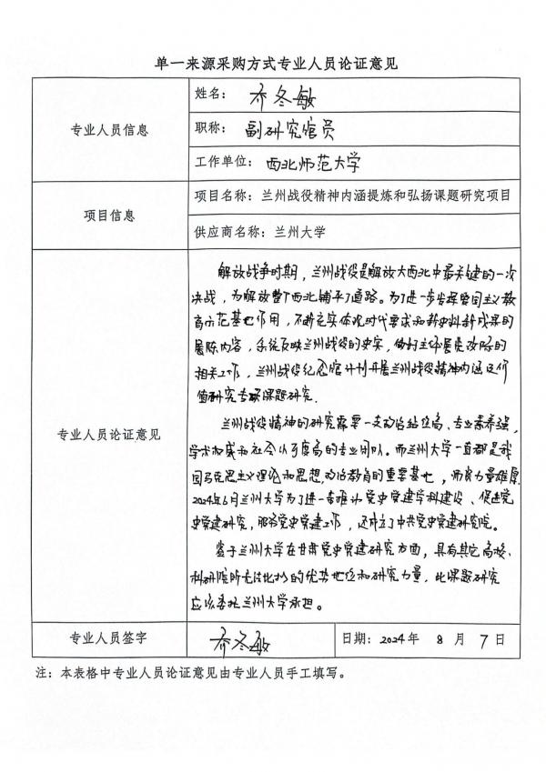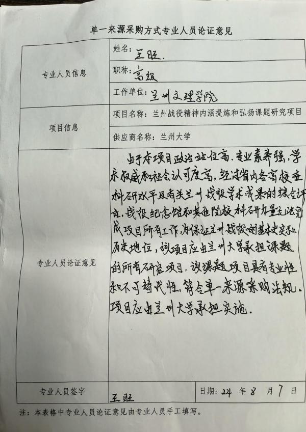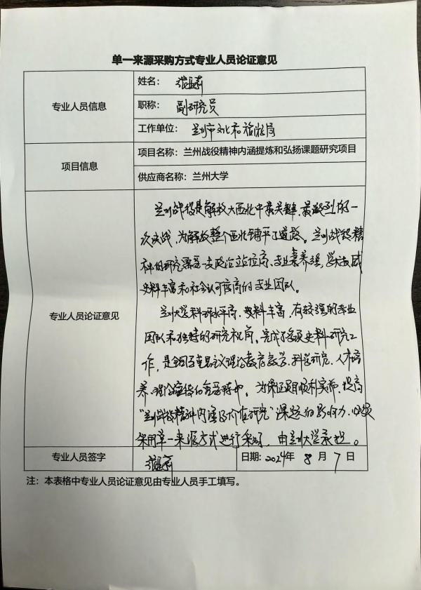 (2)由于本項目政治站位高,專業(yè)素養(yǎng)強,學術權威和社會認可度高,經過省內各高校在科研水平及有關蘭州戰(zhàn)役學術成果的綜合評估,戰(zhàn)役紀念館和其他院??蒲辛α繜o法完成項目所有工作,為保證蘭州戰(zhàn)役的基本史實和歷史地位,該項目應由蘭州大學承擔課題的所有研究項目,該課題項目具有專業(yè)性和不可替代性,符合單一來源采購法規(guī),項目應由蘭州大學承擔實施。
