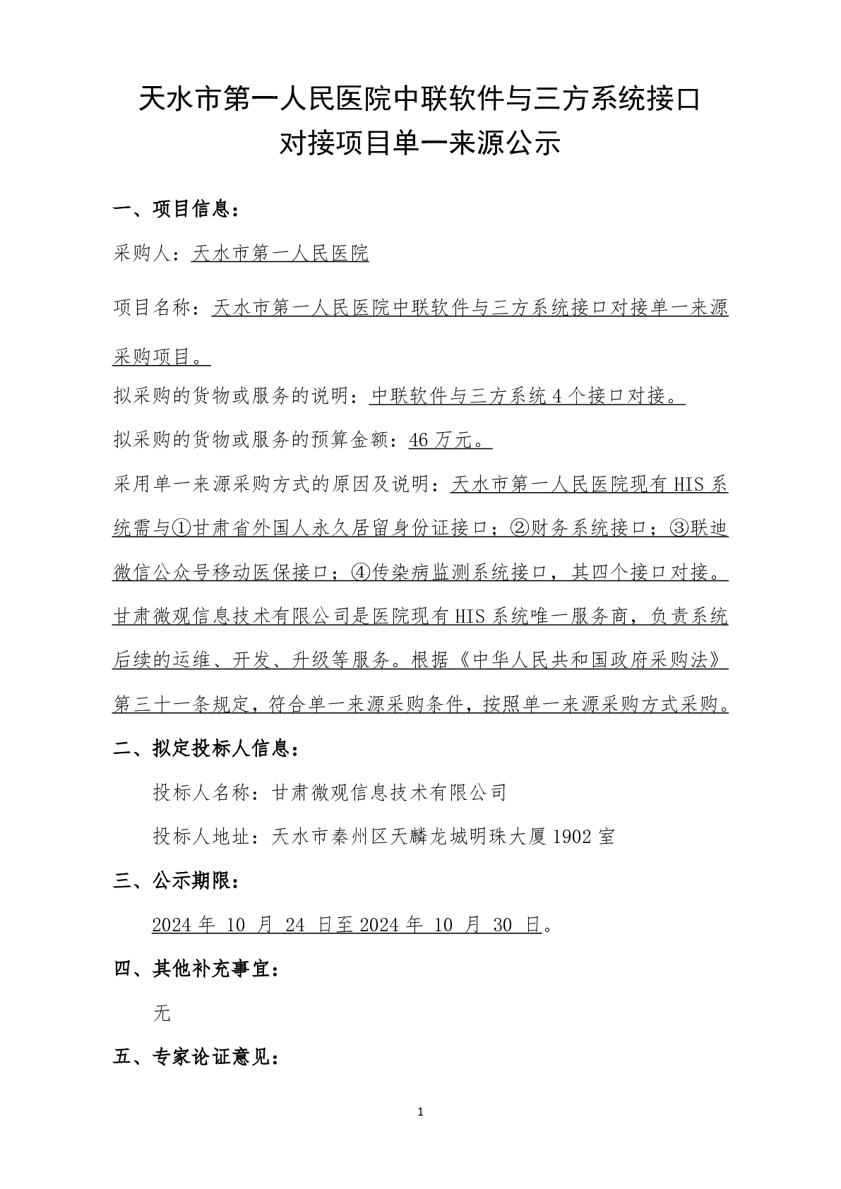 天水市第一人民醫(yī)院中聯(lián)軟件與三方系統(tǒng)接口對接項(xiàng)目單一來源公示