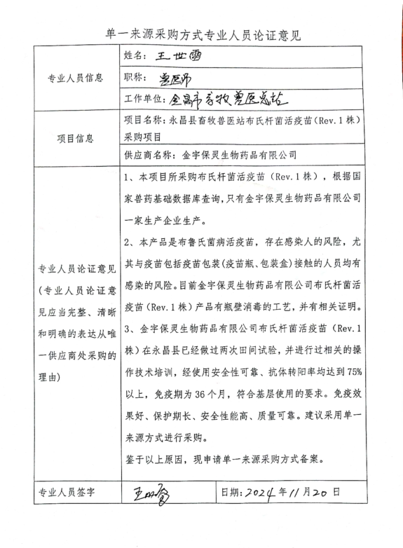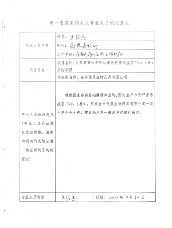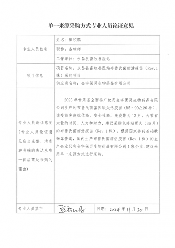 采用單一來源采購方式的原因及說明:按照《甘肅省2024年布魯氏菌病疫苗推薦免疫程序》,省上推薦使用布魯氏菌基因缺失活疫苗(M5–90△26株)、布魯氏菌病活疫苗(Rev.1株)和布魯氏菌活疫苗(S2株),2023年甘肅省全面推廣使用金宇保靈生物藥品有限公司生產(chǎn)的布魯氏菌基因缺失活疫苗(M5–90△26株),該疫苗免疫抗體高、安全性高,但免疫期為12月。為減少人力、物力和財(cái)力,擬選取免疫期36個(gè)月的布魯氏菌病活疫苗(Rev.1株)。從目前國(guó)內(nèi)市場(chǎng)調(diào)查來看,經(jīng)農(nóng)業(yè)農(nóng)村部批準(zhǔn)在國(guó)內(nèi)生產(chǎn)布魯氏菌病活疫苗(Rev.1株)的企業(yè)只有一家,為金宇保靈生物藥品有限公司,近幾年金宇保靈生物藥品有限公司生產(chǎn)的布魯氏菌病活疫苗(Rev.1株),免疫效果好、安全性能高、質(zhì)量可靠。建議該項(xiàng)目采用單一來源方式確定:金宇保靈生物藥品有限公司為該產(chǎn)品供應(yīng)商。