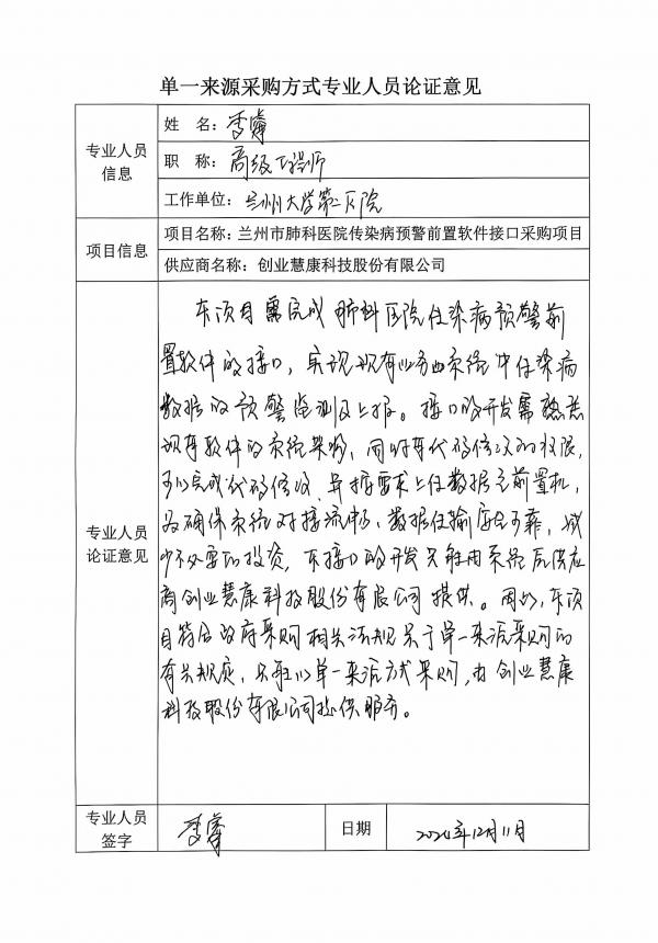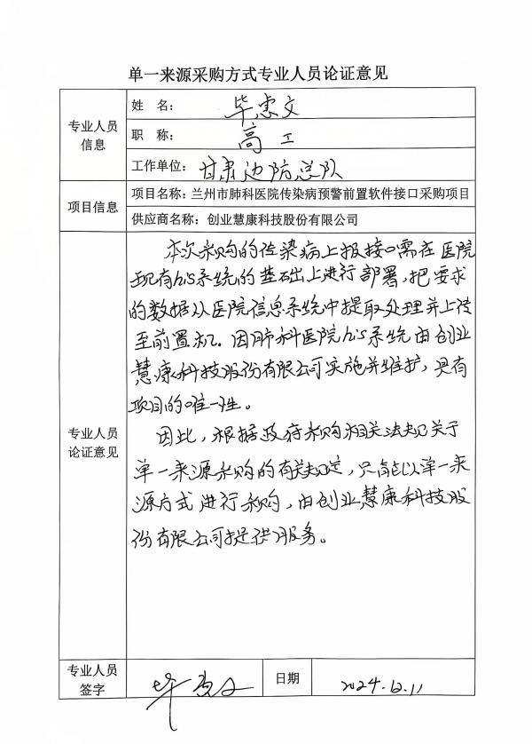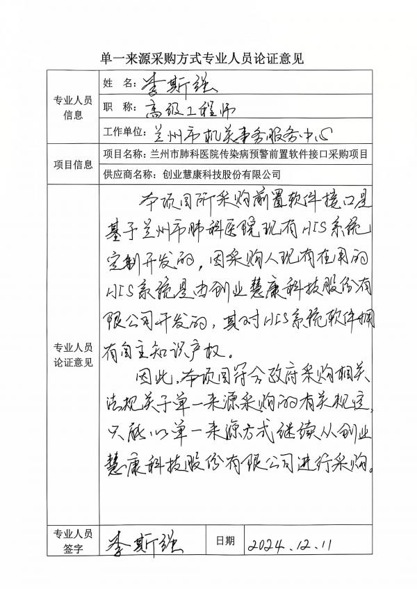 采用單一來(lái)源采購(gòu)方式的原因及說(shuō)明:本次采購(gòu)的傳染病上報(bào)接口需在醫(yī)院現(xiàn)有his系統(tǒng)的基礎(chǔ)上進(jìn)行部署,把要求的數(shù)據(jù)從醫(yī)院信息系統(tǒng)中提取處理并上傳至前置機(jī)。本次傳染病上報(bào)接口有要求和標(biāo)準(zhǔn),需要廠商的技術(shù)支持,按要求對(duì)接;蘭州市肺科醫(yī)院his系統(tǒng)已經(jīng)穩(wěn)定運(yùn)行由創(chuàng)業(yè)慧康科技股份有限公司實(shí)施并維護(hù),無(wú)需其他系統(tǒng)和廠家再次建設(shè)后對(duì)接。綜上所述,故采用單一來(lái)源方式采購(gòu)。