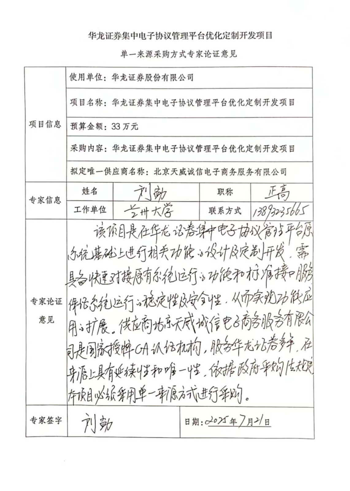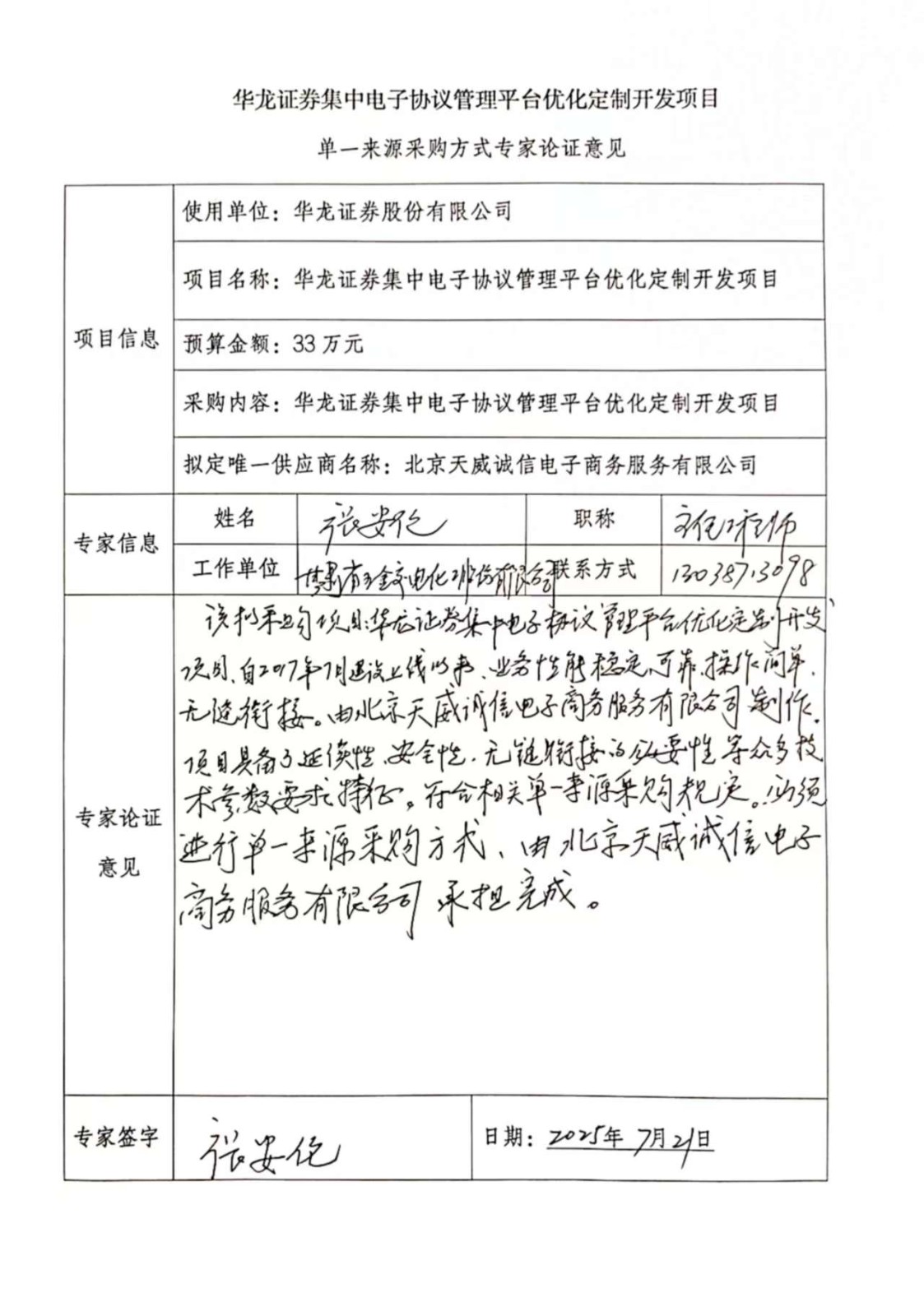 ? ? ?根據(jù)以上特點,我公司擬進行單一來源方式采購北京天威誠信電子商務(wù)服務(wù)有限公司對華龍證券集中電子協(xié)議管理平臺優(yōu)化定制,以進一步完善、提升華龍證券集中電子協(xié)議管理平臺產(chǎn)品使用和運營的能力。
