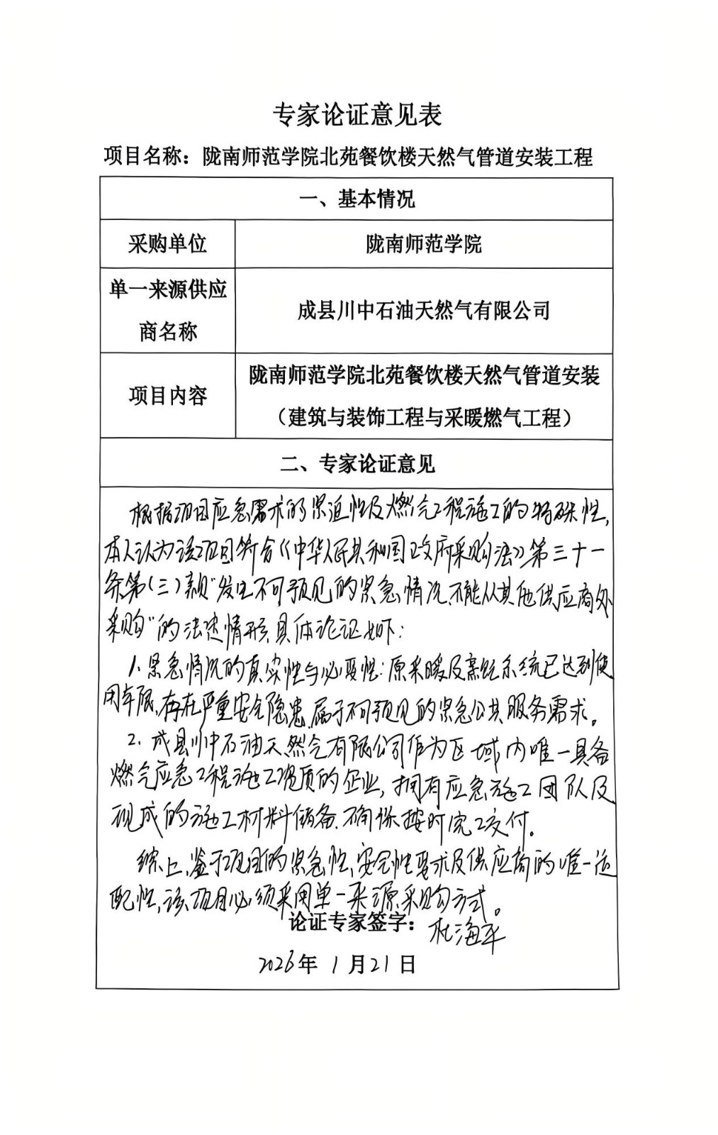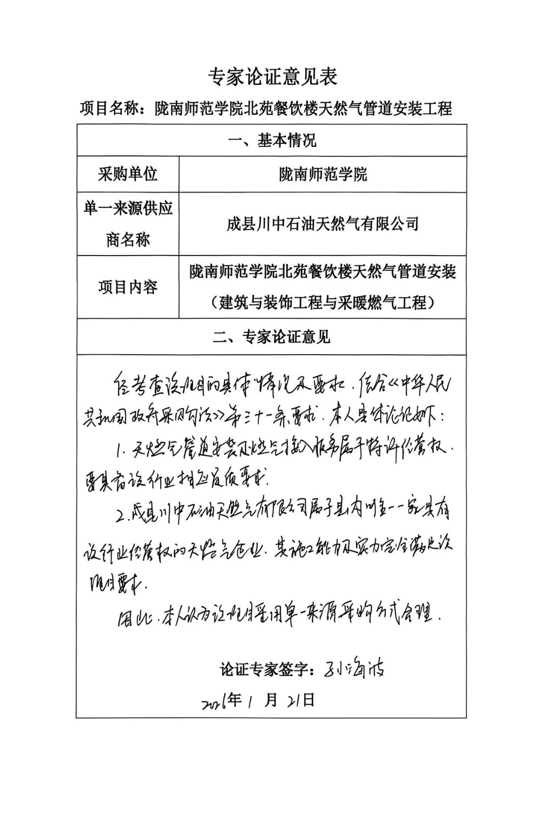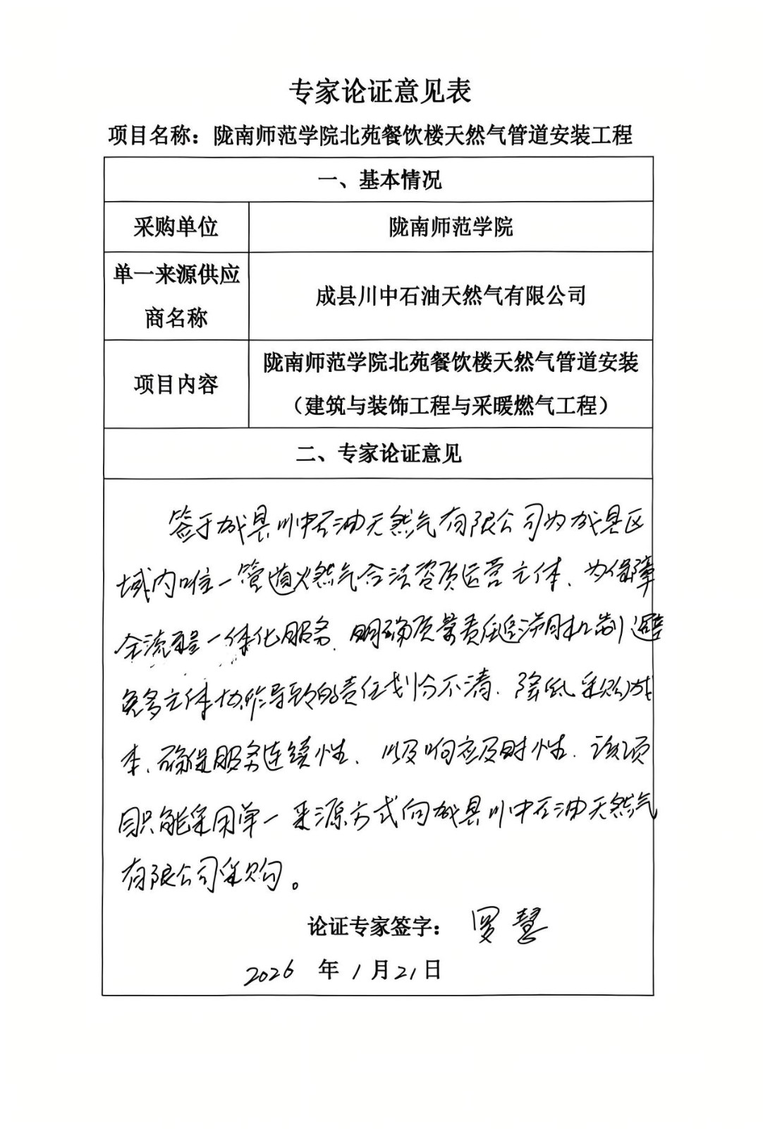 5、采用單一來源采購方式的原因及說明:經(jīng)核查項(xiàng)目技術(shù)文件、地方行業(yè)管理規(guī)定及市場供給情況,該項(xiàng)目符合《中華人民共和國政府采購法》第三十一條第(一)款“只能從唯一供應(yīng)商處采購” 的法定情形,天然氣管道安裝及燃?xì)饨尤敕?wù)屬于公共服務(wù)類項(xiàng)目,根據(jù)隴南市人民政府關(guān)于管道燃?xì)馓卦S經(jīng)營的相關(guān)批復(fù),成縣川中石油天然氣有限公司已依法取得項(xiàng)目所在地管道燃?xì)馓卦S經(jīng)營權(quán),特許經(jīng)營期限內(nèi)為該區(qū)域唯一合法的管道燃?xì)夤?yīng)商。項(xiàng)目所需的氣源接入、管網(wǎng)規(guī)劃、安全監(jiān)管等核心服務(wù)均依賴特許經(jīng)營權(quán)載體,其他市場主體無合法資質(zhì)開展此類業(yè)務(wù)。