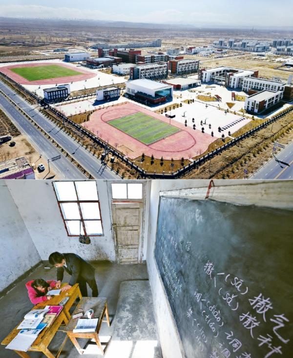 脫貧攻堅(jiān)戰(zhàn)打響以來,甘肅省古浪縣對(duì)南部貧困山區(qū)的3個(gè)鄉(xiāng)和數(shù)十個(gè)行政村實(shí)施易地扶貧搬遷,整鄉(xiāng)整村搬遷至黃花灘生態(tài)移民區(qū),并完善水、電、路、氣、網(wǎng)和學(xué)校、醫(yī)院等公共服務(wù)設(shè)施,大力發(fā)展特色產(chǎn)業(yè),努力使群眾安居樂業(yè)。上圖為2020年3月10日拍攝的古浪縣黃花灘生態(tài)移民區(qū)綠洲生態(tài)移民小鎮(zhèn)的學(xué)校校園(無人機(jī)照片);下圖為2016年4月21日拍攝的古浪縣定寧鎮(zhèn)曉光村王家水小學(xué)教室舊貌。 新華社記者 范培珅/攝