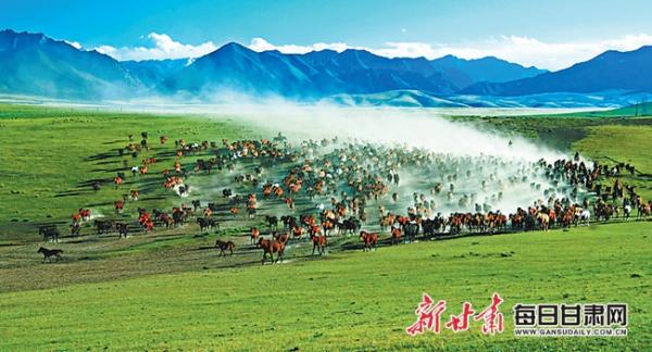 “胡馬,胡馬,遠放燕支山(即焉支山)下,跑沙跑雪獨嘶,東望西望路迷。迷路,迷路,邊草無窮日暮?!?nbsp;唐代詩人韋應(yīng)物的一曲《調(diào)笑令·胡馬》,描繪了一幅雄偉壯麗的圖景:成群的駿馬放牧于焉支山下的大草原上,綿延的群山、無邊的草原、奔騰的駿馬,氣勢壯觀,境界闊大。這便是山丹馬場,地處祁連山冷龍嶺北麓的大馬營草灘(史稱漢陽大草灘),這里地域廣闊,土壤肥沃,水源充足,牧草豐盛,是天然的駐牧場所。