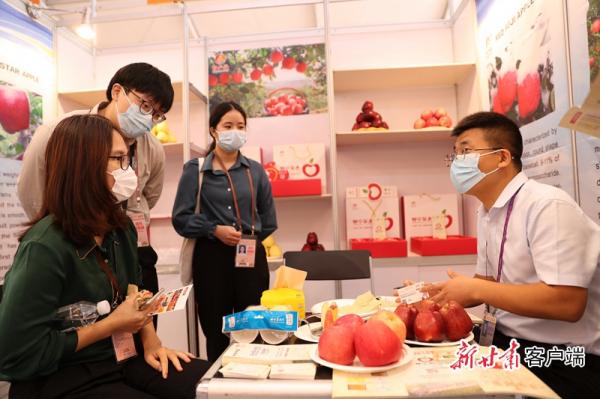 外地采購商在甘肅企業(yè)展位了解靜寧蘋果。